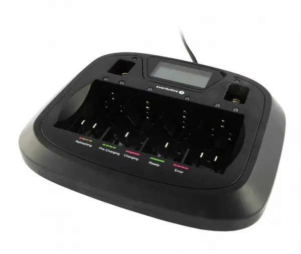 - Універсальність – один зарядний пристрій EverActive NC 900U дозволяє заряджати акумулятори різних форматів (від ААА до D R20 та крон). Якщо Ви використовуєте акумулятори різних розмірів Вам не доведеться купувати кілька зарядних пристроїв - з усією роботою впорається один зарядний пристрій NC 900U: